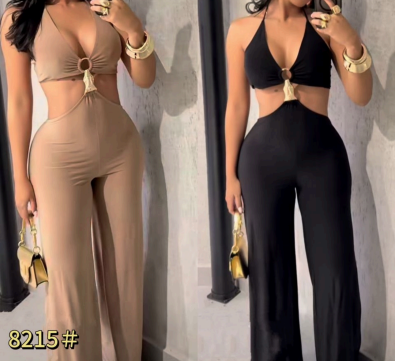 Flattering halter jumpsuits with bold cut-outs and wide-leg silhouette.