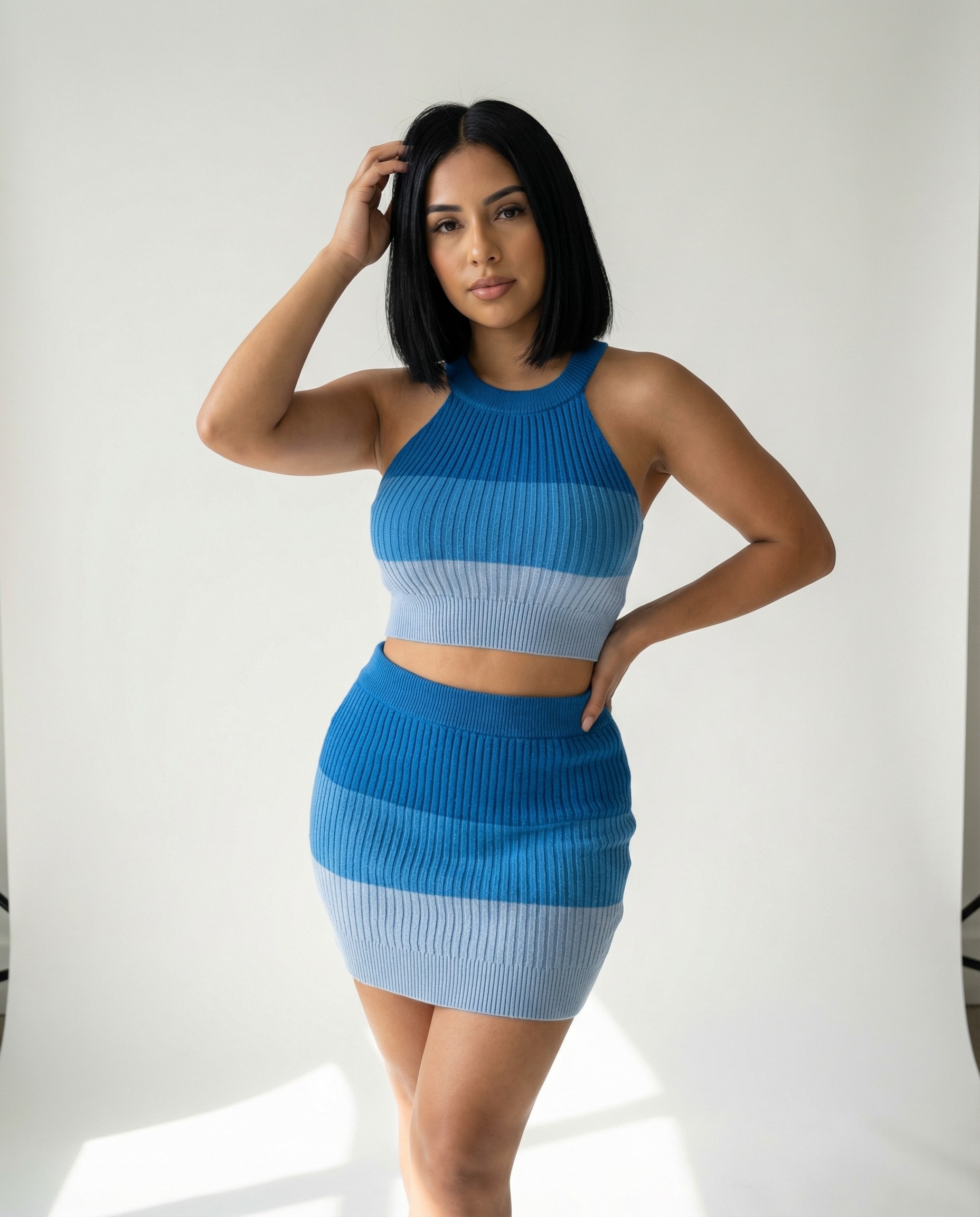 - Two-piece ribbed knit set featuring a halter crop top