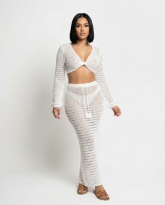 Ribbed and crochet skirt sets creating versatile, body-contouring silhouettes.